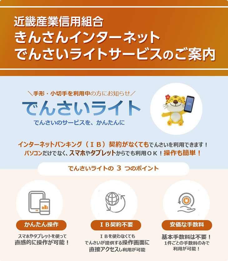…当組合のIB契約(きんさんビジネスダイレクト)が必要です。お使いのパソコンからIBを通じて、でんさいのサービスが利用可能です。 - でんさいライト