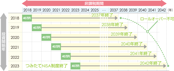 2023年末でつみたてNISAの制度は終了となりましたが、2023年までにスタートしたつみたてNISA投資分は下図のとおり各年のつみたてNISAの非課税期間終了まで運用が継続できます。 (2024年からの新NISAの非課税保有限度額とは別枠になります。)
